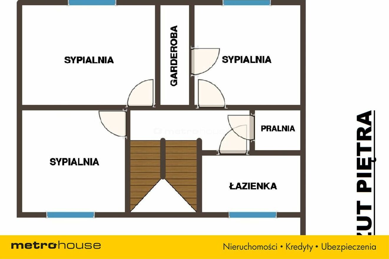 - Piętro: trzy oddzielne sypialnie, łazienka z wanną, garderoba oraz dodatkowy schowek